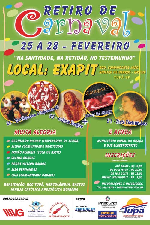 Pregadores: Celina Borges, Ziza Fernandes, Reginaldo Magar, Silvinho Zabisky (Comunidade Beatitudes), Luiz (Comunidade Gábata), Pe. Wilson Ramos e Irmão Alegria (Toca de Assis).